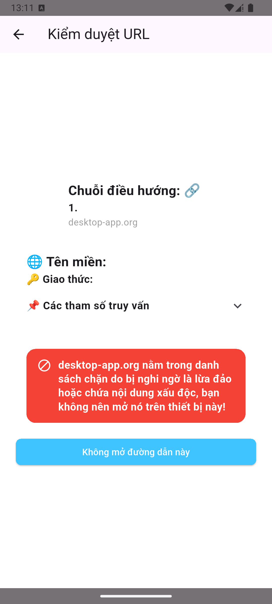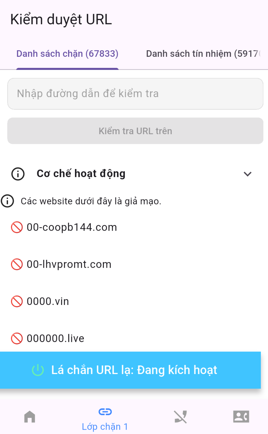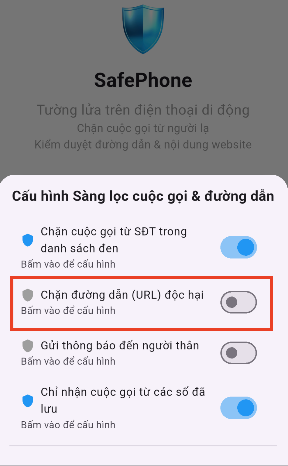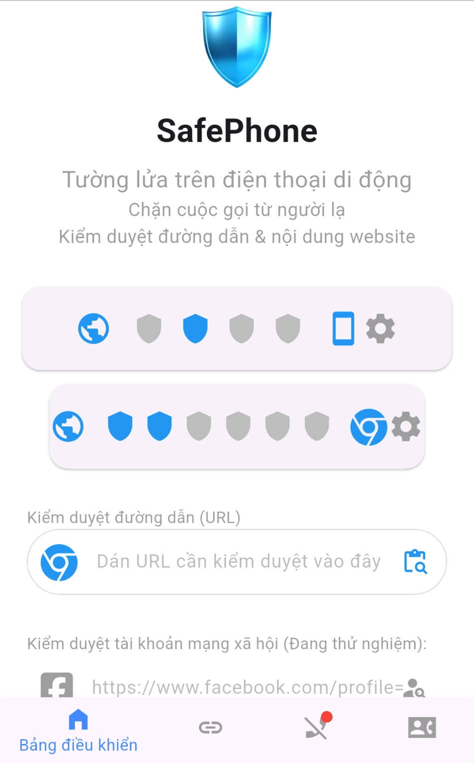 Tính năng "Kiểm duyệt đường dẫn" của SafePhone giúp bảo vệ người dùng khỏi các trang web độc hại hoặc không an toàn. Khi tính năng này được bật, SafePhone sẽ kiểm tra các URL trước khi người dùng mở chúng, xác minh xem trang web đó có chứa phần mềm độc hại, lừa đảo, hoặc các nội dung nguy hiểm hay không. Nếu phát hiện URL nguy hiểm, ứng dụng SafePhone sẽ cảnh báo người dùng hoặc ngăn không cho truy cập, giúp giảm thiểu rủi ro bảo mật và bảo vệ sự an toàn khi duyệt web.