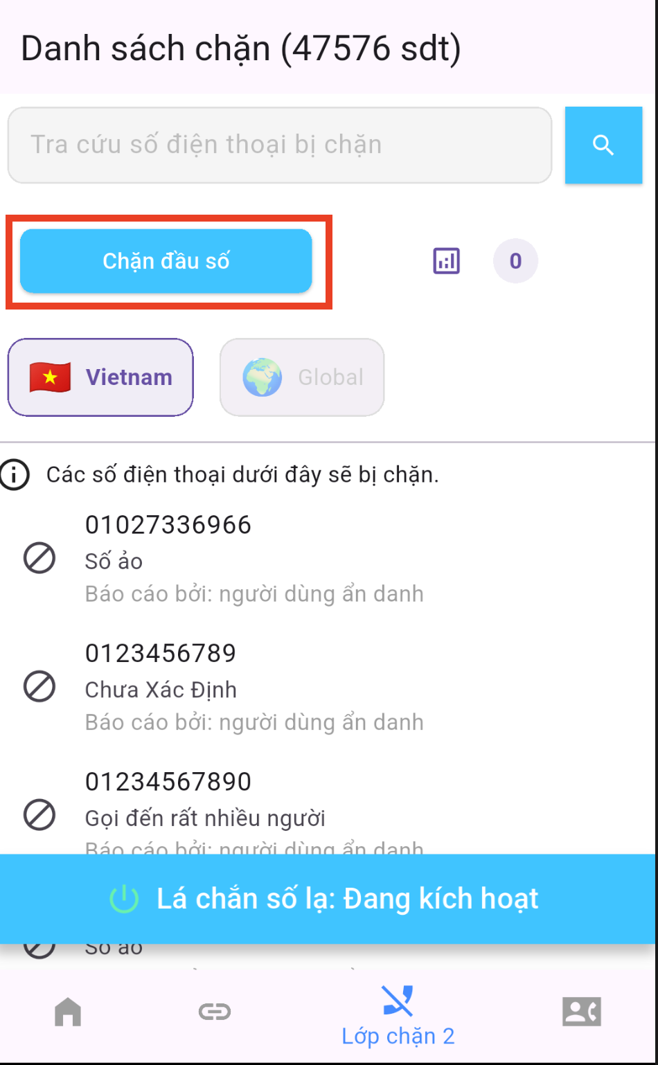- Bấm vào "Chặn đầu số"
