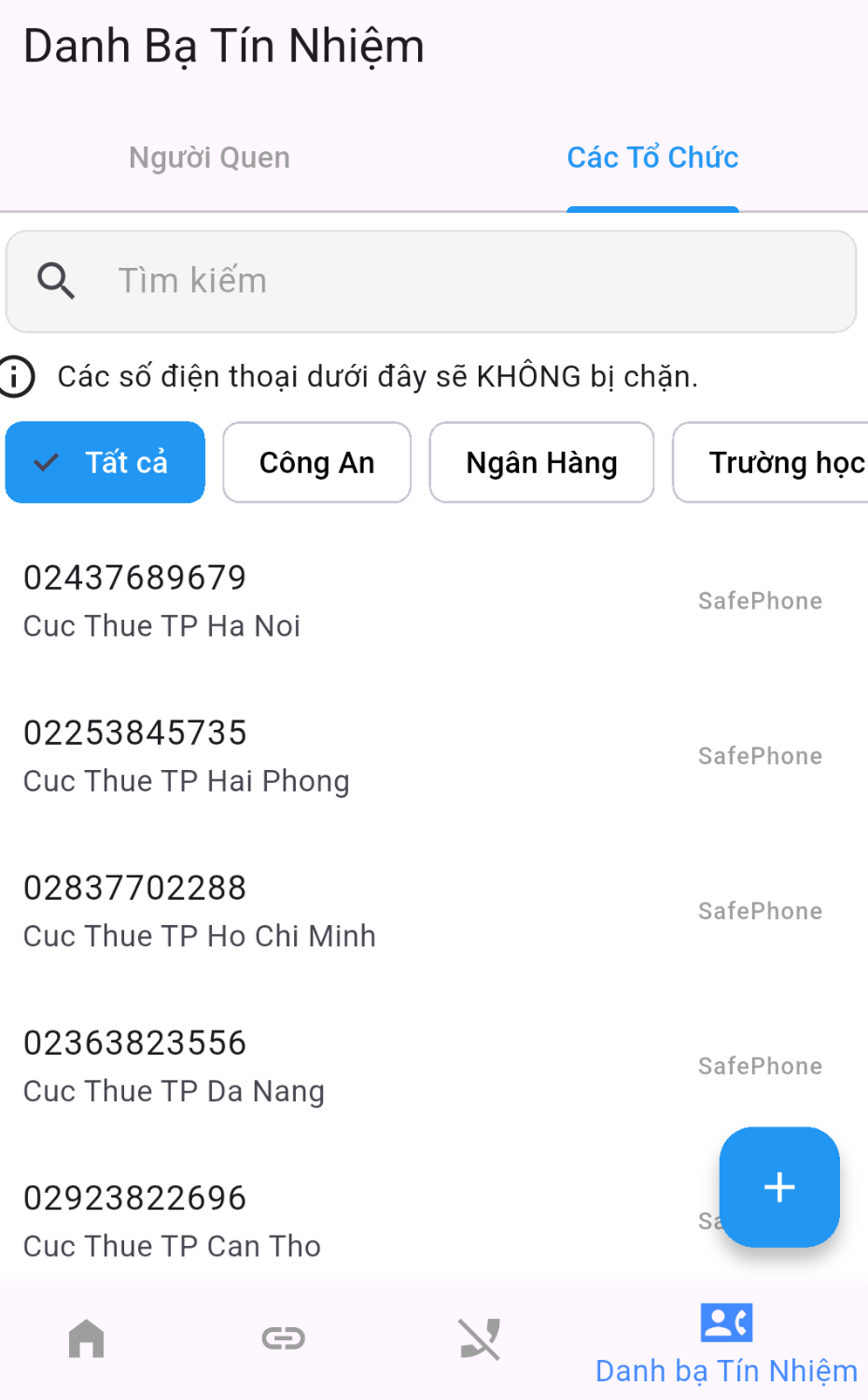Ngoài các số điện thoại bạn đã lưu, SafePhone còn tích hợp sẵn danh sách các số điện thoại của các cơ quan, tổ chức, dịch vụ công, ngân hàng và các công ty thường xuyên bị bạo danh như điện lực, viễn thông, du lịch, ...
