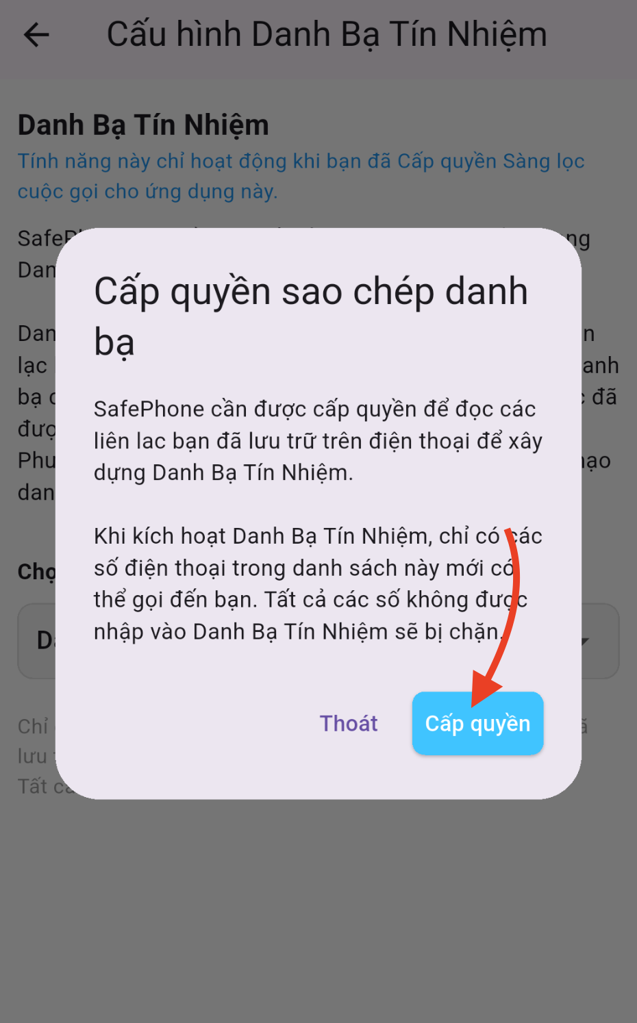 Sau khi bấm Cho phép, các liên lạc bạn đã lưu trước đó sẽ được nhập vào danh sách tín nhiệm bên trong ứng dụng. Sau đó SafePhone sẽ chỉ nhận cuộc gọi từ những người đã lưu trong danh sách tín nhiệm giúp bạn tránh hoàn toàn các cuộc gọi không mong muốn.