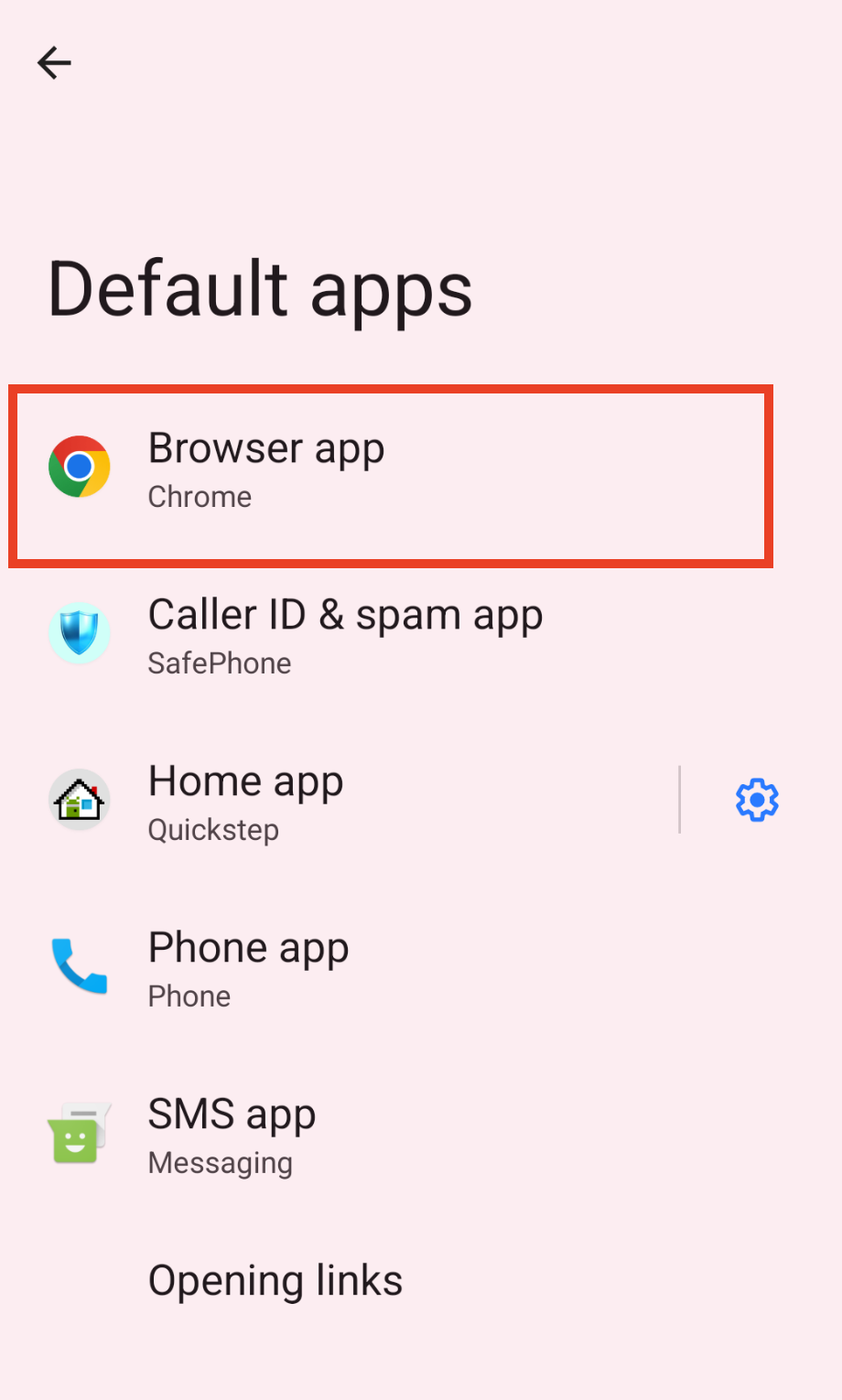- Một màn hình khác hiện lên, bạn Bấm tiếp vào dòng Trình duyệt mặc định hoặc Browser App nếu bạn sử dụng tiếng Anh